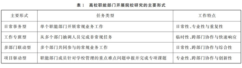 上述职能部门开展院校研究实践的四种形式,在任务类型和工作特点方面存在差异,其主要区别如表1所示。