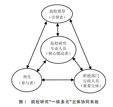 教育强国建设的“龙头”是高等教育,其发展涉及的利益相关者不仅规模庞大,而且诉求多样、关系复杂。因此,在高等教育领域,利益相关者的协同尤为重要。院校研究的利益相关者主要有高校领导、院校研究专业人员、职能部门行政人员和师生,他们之间是否协同以及协同程度如何,直接决定院校研究能否以及在多大程度上提升高校治理效能。在理想的院校研究中,多元主体构成一个如图1所示的协同系统,其中高校领导是引领者,院校研究专业人员是核心推动者,职能部门行政人员是重要主体,师生是参与者。