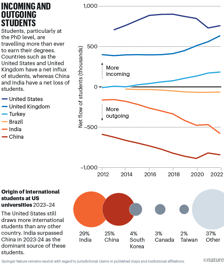 不过,专家表示这种传统流动趋势可能放缓,主要源于两大因素:一是中低收入国家教育资源日益丰富,二是许多富裕国家对国际学生的接纳度下降。英国、加拿大、澳大利亚均实施了移民限制政策,导致国际本科生与研究生入学人数减少;美国的反移民政策也不断升级,特朗普政府已吊销超1400份签证、限制19个国家公民入境,并提议将博士签证有效期限制在4年(尽管美国许多博士项目学制远超4年)。美国华盛顿特区非营利组织“国际教育工作者协会(NAFSA)”预测,到2025-2026学年,美国国际学生入学人数将较前一学年减少30%-40%,这将导致约70亿美元收入损失及6万个工作岗位流失。