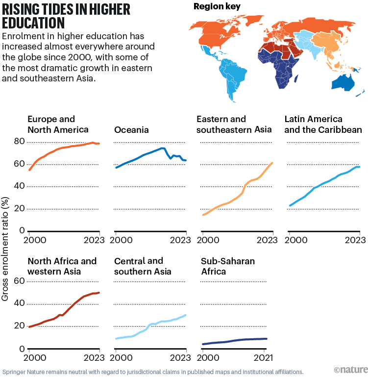 阅读提示:近日,《自然》杂志刊登记者丹·加里斯托专题文章,认为全球高等教育在读学生已达2.64亿,高等教育毛入学率从2000年的19%升至2024年的44%,增长主要集中在中低收入国家及私立教育领域。国际化进程表现为跨境学生数量增长至690万,但传统留学目的国因政策收紧导致吸引力下降,学生流向趋于多元化,同时海外分校模式迅速发展。教学内容日益侧重科学、技术、工程与数学(STEM)领域,中美科研合作规模领先但增速放缓。尽管面临质量参差、人才流失等挑战,但全球高等教育总体仍呈持续扩张趋势。以下是文章的主要观点。