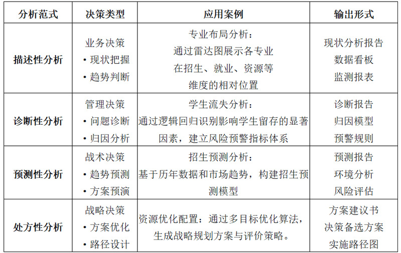 其三,院校研究分析范式逐步实现专业化进阶。从描述性分析、诊断性分析,到预测性分析与处方性分析,院校研究人员协同技术人员通过学业预警模型构建、招生预测系统开发、资源优化算法设计等实践项目,在解决实际问题中实现分析能力的持续进阶。