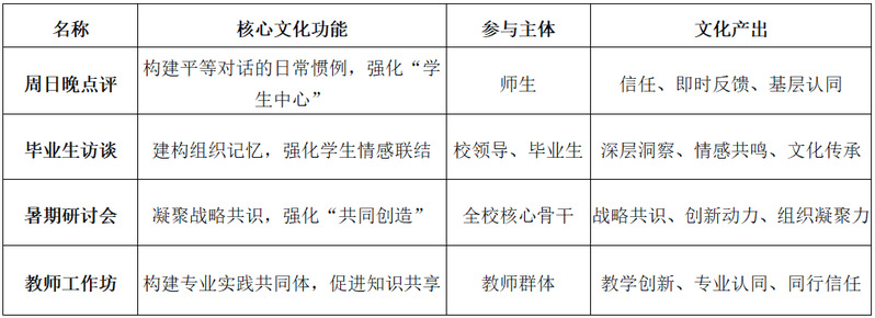 文化赋能机制构成“共同创造”模式的深层支撑,通过系统化的文化建构与制度性交流实践,营造尊重专业价值、激励协同创新的组织氛围。时任校长刘献君高度重视文化在院校研究中的基础性作用,提出“共同目标、共同创造、共同发展”的组织文化,在他的推动下,文华学院建立了包括“周日晚点评”、“毕业生深度访谈”等在内的制度性交流体系,为“共同创造”模式提供了深厚的文化支撑。